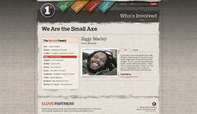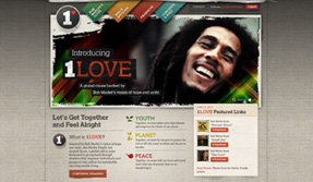 As a means to initiating the 1Love Global Movement, the teaser site features a multitude of helpful information such as benefitting charities, available 1Love products, concerts and community buzz, and bios on each of the participating Marley members. By incorporating social media, such as Facebook Connect, Twitter and YouTube, users can join the 1Love Community, where they become true activists in the cause—voicing their thoughts, receiving weekly news and exclusive invitations to events, and earning Love Points anytime they participate in the movement.