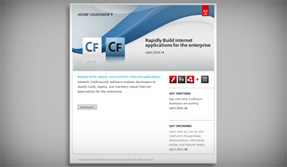 For enterprise developers, getting their RIAs built and deployed with extreme haste is of the utmost importance. To aid in Adobe’s ColdFusion campaign, we created a series of assets that drove awareness to the respective online demos: e-mail, large-scale event banners and an online marquee. The main goal: generate awareness around the enterprise solution for developers and generate trial downloads. Using the look and feel from the ColdFusion packaging, we created a unified design that would live across all assets which provided overall consistency for the campaign. While the banner and e-mail were both static assets, we leveraged video assets for the online marquee as a way of creating a more engaging and interactive payoff.