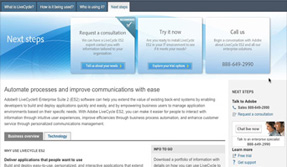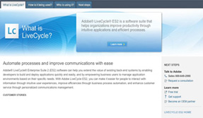 To build awareness around the product, and to educate users on the different usage aspects, we created both an online marquee (one that lives inline with the Adobe site and acts as a “super banner”) and a series of product demos. The marquee quickly grabs the user’s attention and offers bite-sized product info enough to entice users to either learn more by watching the demos or to contact an Adobe sales representative for more information and a free trial. The demos, on the other hand, are used to display the full scale of the product and the practical uses behind the various applications be it an online enrollment framework, how to set up automated e-mails or how to file an interactive insurance claim. As a long-term Adobe partner, we’ve found that advertising marquees that feature both testimonials and short, hard-hitting facts about the product have helped increase leads and trial participation. And online demos have become strong drivers for acquisition and fulfillment.
