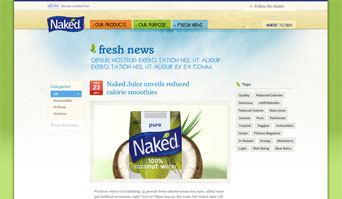 Pero más que cambiar la funcionalidad del sitio, hemos puesto un gran énfasis en el contenido. Naked siempre se ha basado en la sostenibilidad y la responsabilidad corporativa, pero con el paso de los años ellos han aumentado sus inversiones a través del outsourcing, la transición de todas las botellas 100% reciclados y reciclables, construyen una planta embotelladora LEED Certified. Más allá de contar la historia de jugo y su historia, que forma de nuevo su contenido y slogan de marca para asegurar su mensaje de responsabilidad corporativa un gran reto, sólo trabajamos en que no sonara tan corporativa.
