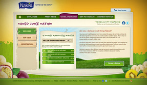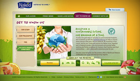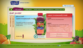 Being a grassroots company, Naked Juice knew that their acquisition by PepsiCo may turn off some of their loyal fans. To help them maintain a mom and pop feel, we created a fun, engaging site chock full of personality. Throughout it, users can get the skinny on Naked Juice’s commitment to healthy living, a healthier environment and good, all-natural juice.