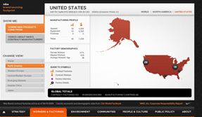 A key feature of the site is its interactive map that shows Nike Brand contract factories throughout the world. Users can select any of the 46 countries to learn about Nike employment information, including factory demographics, total sales, and the manufacturing profile.