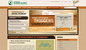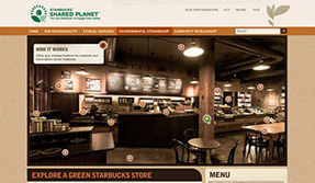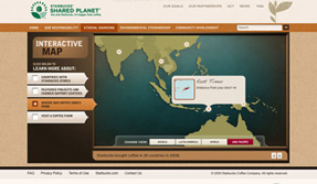 The answer was Starbucks Shared Planet. This online experience broadcast all of the company's eco-friendly initiatives—and made them easily digestible. At a glance, visitors could get a sense of the big picture immediately. They could also follow the progress of specific Starbucks programs (eco-friendly bean sourcing, for example), interacting with charts, maps and videos along the way. Much like the Social Responsibility Report, Shared Planet was entirely transparent. It was honest. Only now, brought to life online, it was interactive and inspiring—actually encouraging people to get involved by taking our "Mug Pledge" or volunteering time to a number of Starbucks' global causes.
