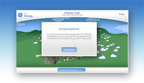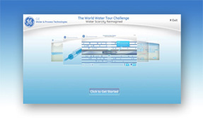 In the GE Water kiosk, players were taken on The World Tour Water Challenge where they had to provide clean water to three international cities suffering from water shortages with each game challenge representing a step in the water purification process. First, transport clean irrigation water to local farms, second, assemble a desalination plant to bring clean water to the local town for drinking, and third, purify the water before it was transported to the city for use.