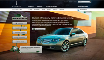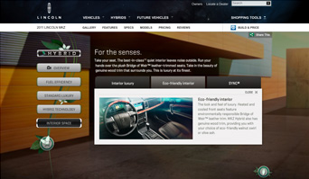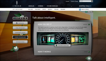 Our strategy was to create an experiential site that immersed visitors in the brand’s offerings. And because the MKZ Hybrid is a very responsible and proactive vehicle, we also wanted users to leave with a feeling that such a sustainable and luxurious car would enhance their lives while helping the planet. To accomplish this goal, we created a Flash-based site that spoke to viewers through engaging features, such as the dashboard demo, and interactive social elements, including a Facebook badge. We showcased the advanced technology of the MKZ Hybrid’s unique SmartGauge™ with EcoGuide dashboard through an exact replication of its four modes. By leveraging the Flash platform to build the dashboard, users could interact with the different tools and learn how each enriches the driving experience. The modes in order from least to most detailed are: