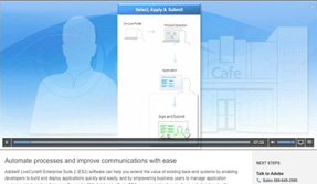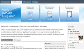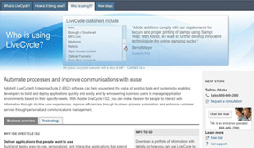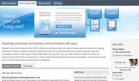 To build awareness around the product, and to educate users on the different usage aspects, we created both an online marquee (one that lives inline with the Adobe site and acts as a “super banner”) and a series of product demos. The marquee quickly grabs the user’s attention and offers bite-sized product info enough to entice users to either learn more by watching the demos or to contact an Adobe sales representative for more information and a free trial. The demos, on the other hand, are used to display the full scale of the product and the practical uses behind the various applications be it an online enrollment framework, how to set up automated e-mails or how to file an interactive insurance claim. As a long-term Adobe partner, we’ve found that advertising marquees that feature both testimonials and short, hard-hitting facts about the product have helped increase leads and trial participation. And online demos have become strong drivers for acquisition and fulfillment.