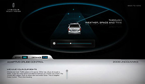 Working with the style created for the offline campaign by Wunderman and Y&R, BLITZ created a futuristic setting that took full advantage of motion, sound and sleek and seductive design. Advanced technology features, such as adaptive headlamps and cruise control, and connectivity and multimedia options were highlighted throughout via interactive vignettes. Additionally, the site included video demonstrations and interviews from Lincoln designers and engineers who spoke about the detail and ingenuity that went into this all-new techno/luxury line.