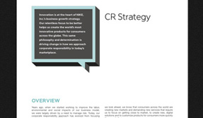 The site also offers quick links to company information, such as various business models, environmental goals, company processes and employment policies. There are also charts ranking Nike’s social impact, target vs. actual levels of output per division, resource utilization and sustainable practices. Users can choose to download the CSR report by chapter or in full, and can reference the site’s detailed glossary of NIKE, Inc’s acronyms and initiatives to help further comprehension of the report and truly understanding what makes Nike run.