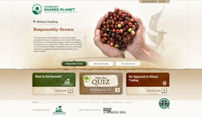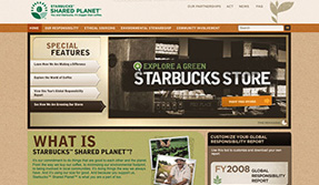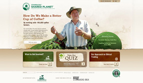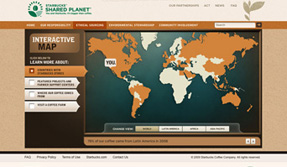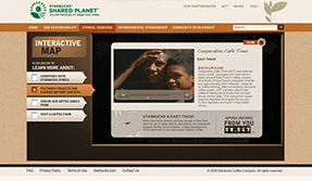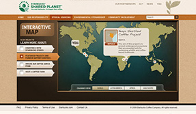 The answer was Starbucks Shared Planet. This online experience broadcast all of the company's eco-friendly initiatives—and made them easily digestible. At a glance, visitors could get a sense of the big picture immediately. They could also follow the progress of specific Starbucks programs (eco-friendly bean sourcing, for example), interacting with charts, maps and videos along the way. Much like the Social Responsibility Report, Shared Planet was entirely transparent. It was honest. Only now, brought to life online, it was interactive and inspiring—actually encouraging people to get involved by taking our "Mug Pledge" or volunteering time to a number of Starbucks' global causes.