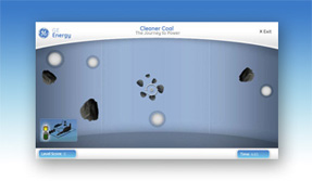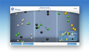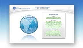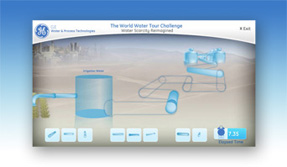 In the GE Water kiosk, players were taken on The World Tour Water Challenge where they had to provide clean water to three international cities suffering from water shortages with each game challenge representing a step in the water purification process. First, transport clean irrigation water to local farms, second, assemble a desalination plant to bring clean water to the local town for drinking, and third, purify the water before it was transported to the city for use.